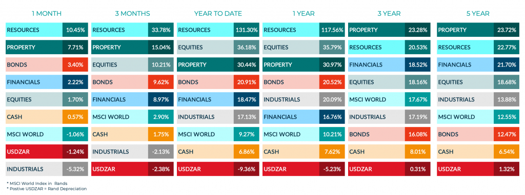 The table below represents a rolling year view of the major asset class returns that we track. It offers a view of the asset classes we use to diversify your portfolio.